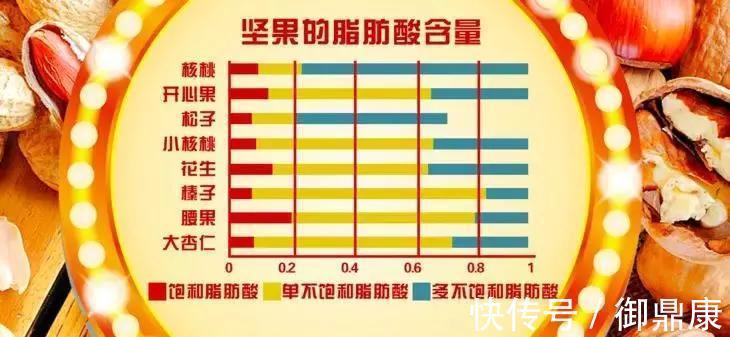 坚果不饱和脂肪酸含量丰富。《国际流行病学期刊》上的一项研究显示,只要每天吃10克坚果,就能显著降低人们死于常见疾病的风险,使死于心脏病、癌症、糖尿病和神经退行性疾病的风险分别降低17%、21%、30%和47%。